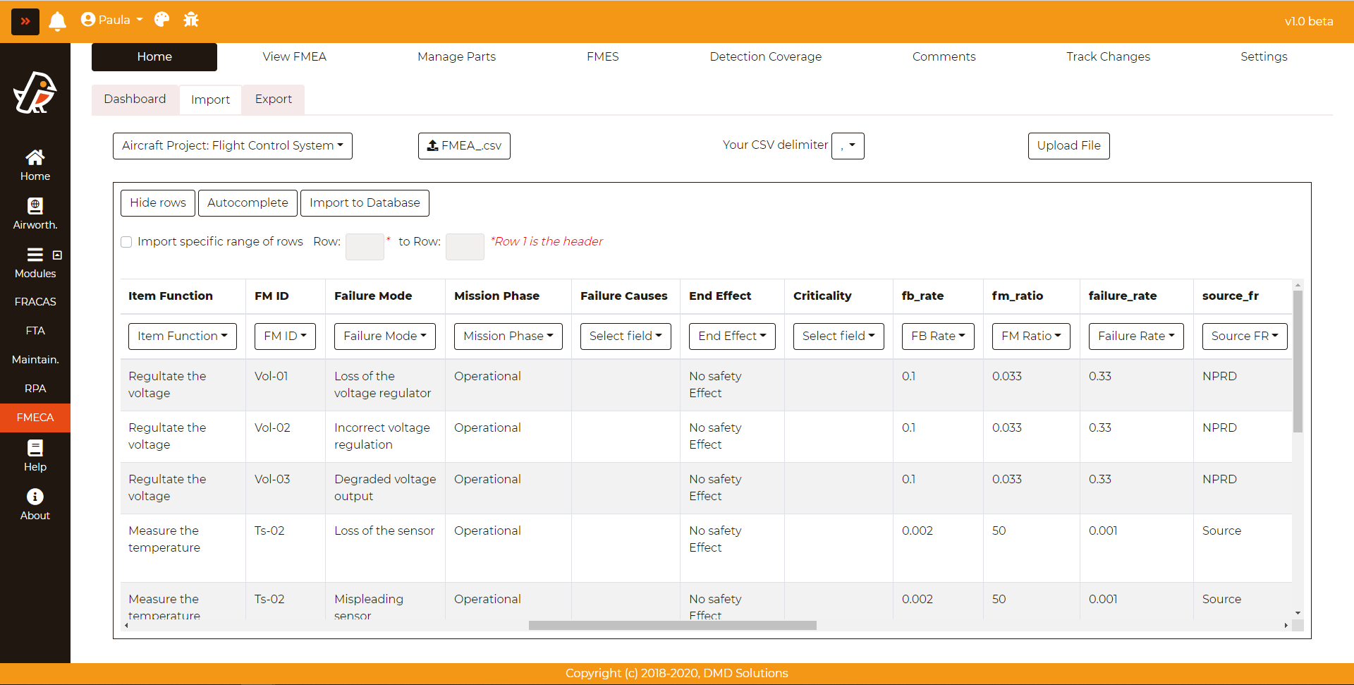 Similarily to the export, the user can import data to the database. To do so, select the proper system in FMECA > Home > Import, select the file via a windows dialog and specify how the CSV is delimited (comma, semicolon, dot, vertical bar or a tabulation).