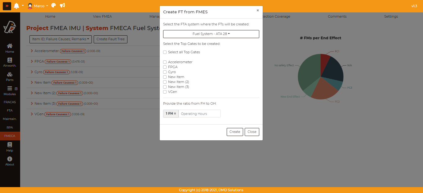 After clicking the “Create Fault Tree” button and choosing an FTA system to place the fault trees in, you can choose what top gates to include in them and provide the ratio from OH-FH ratio. This all results in a fault tree like the one below.