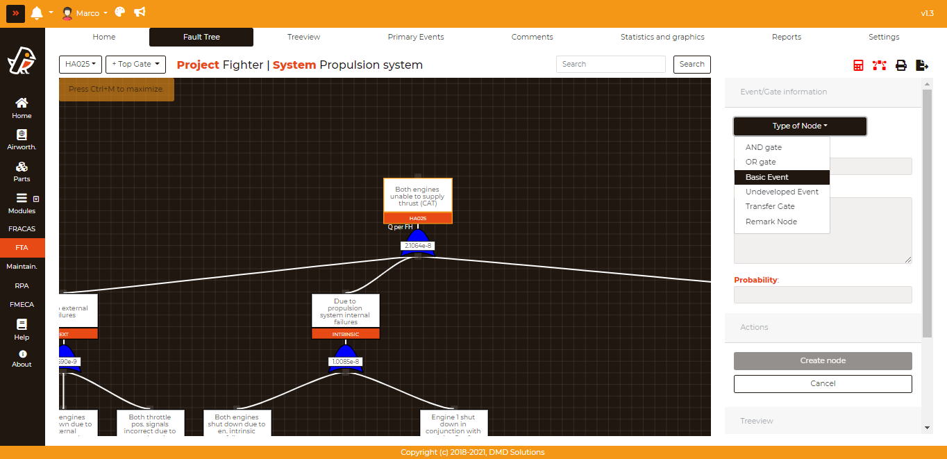 With this, when creating child nodes for a parent node in a fault tree, the user can choose to create one linked to an FM. To do this, the user must simply click on a parent node, click on Add Child on the side tab, and then click on the Type of Node dropdown menu.