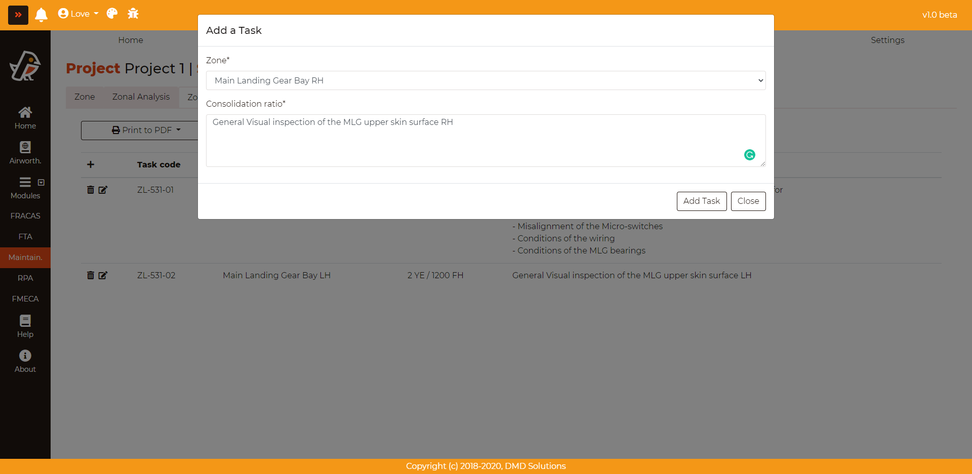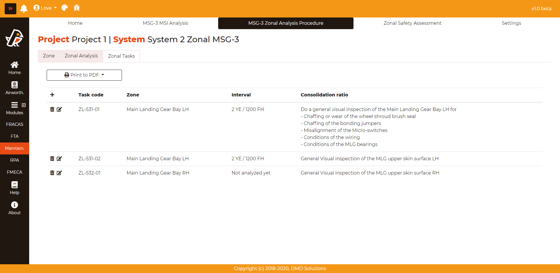 Robin allows to print a report about the MSG-3 Zonal Analysis Procedure. It contains all the zone with its corresponding information. It also contains all the analysis performed with the resulting interval. Also, all the tasks related to each zone are listed:
