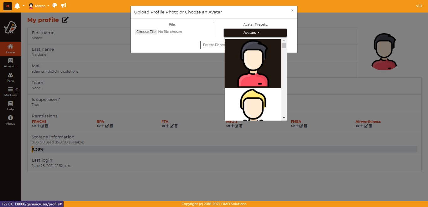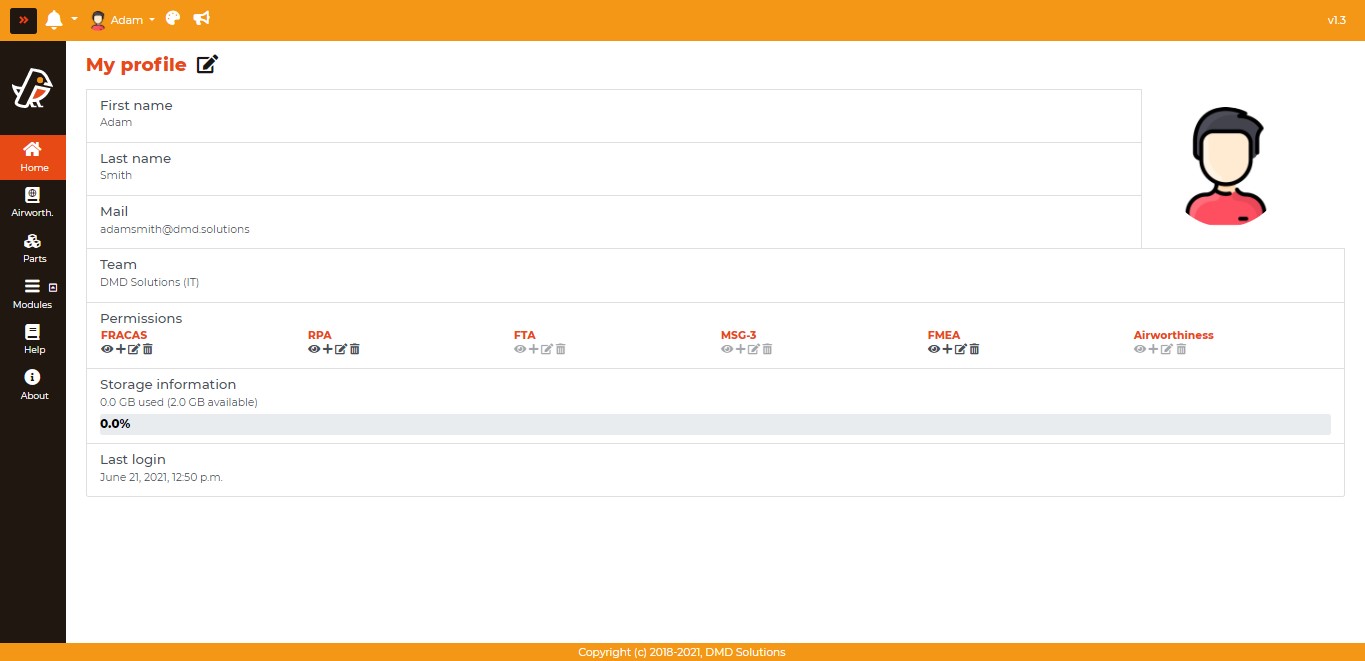 If you are in a team, the name is indicated under the Team field. The Permissions field indicates your permission per module, expressed by four icons: view, add, modify, and delete. If any of the corresponding icons is gray, this means that you do not have that permission. The Storage Information field shows the amount of storage you have taken up (regarding file uploads). Finally, the image on the top right is your profile picture.