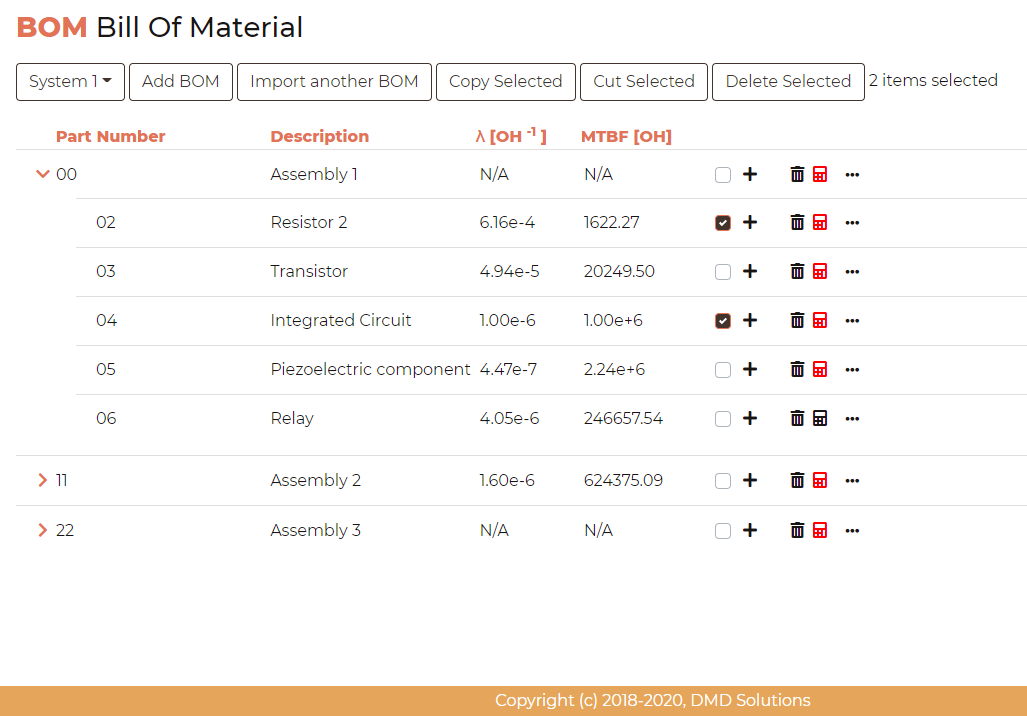 System Tree: The hierarchy (levels) of the BOM is presented. Moreover, the overall contribution of each item to the failure rate is also given