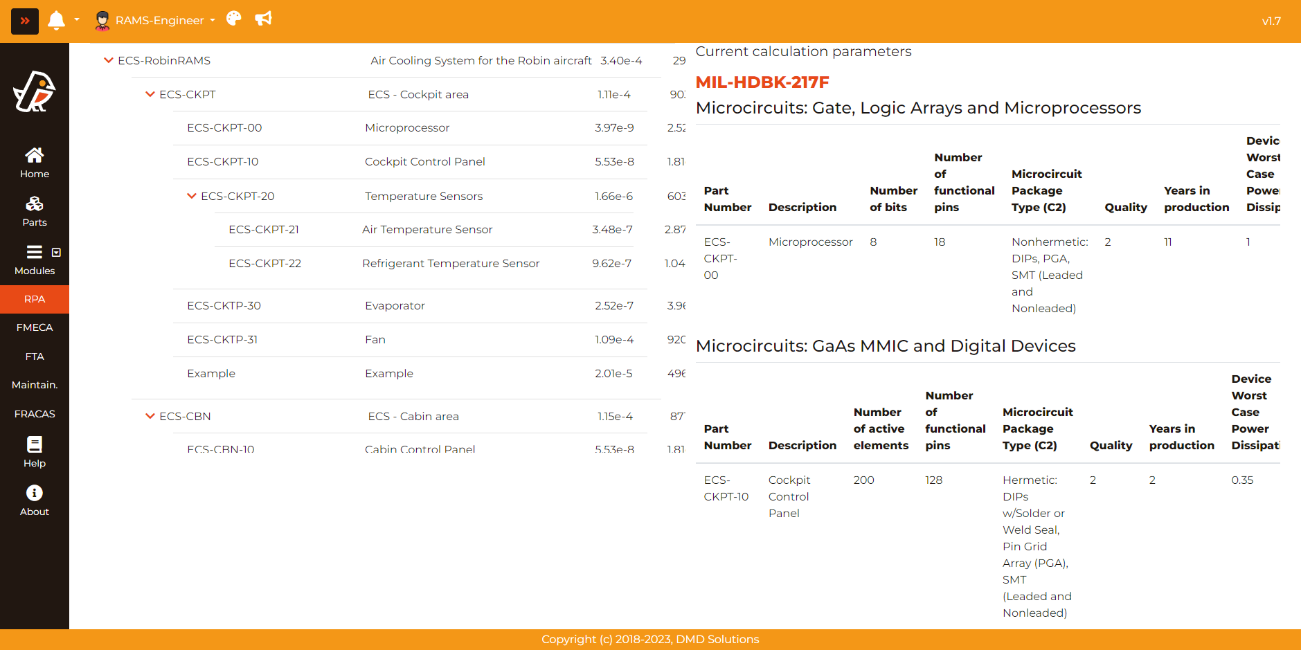 See calculation parameters: After clicking this button, the tool will show all the parameters used to compute the reliability of the parts.