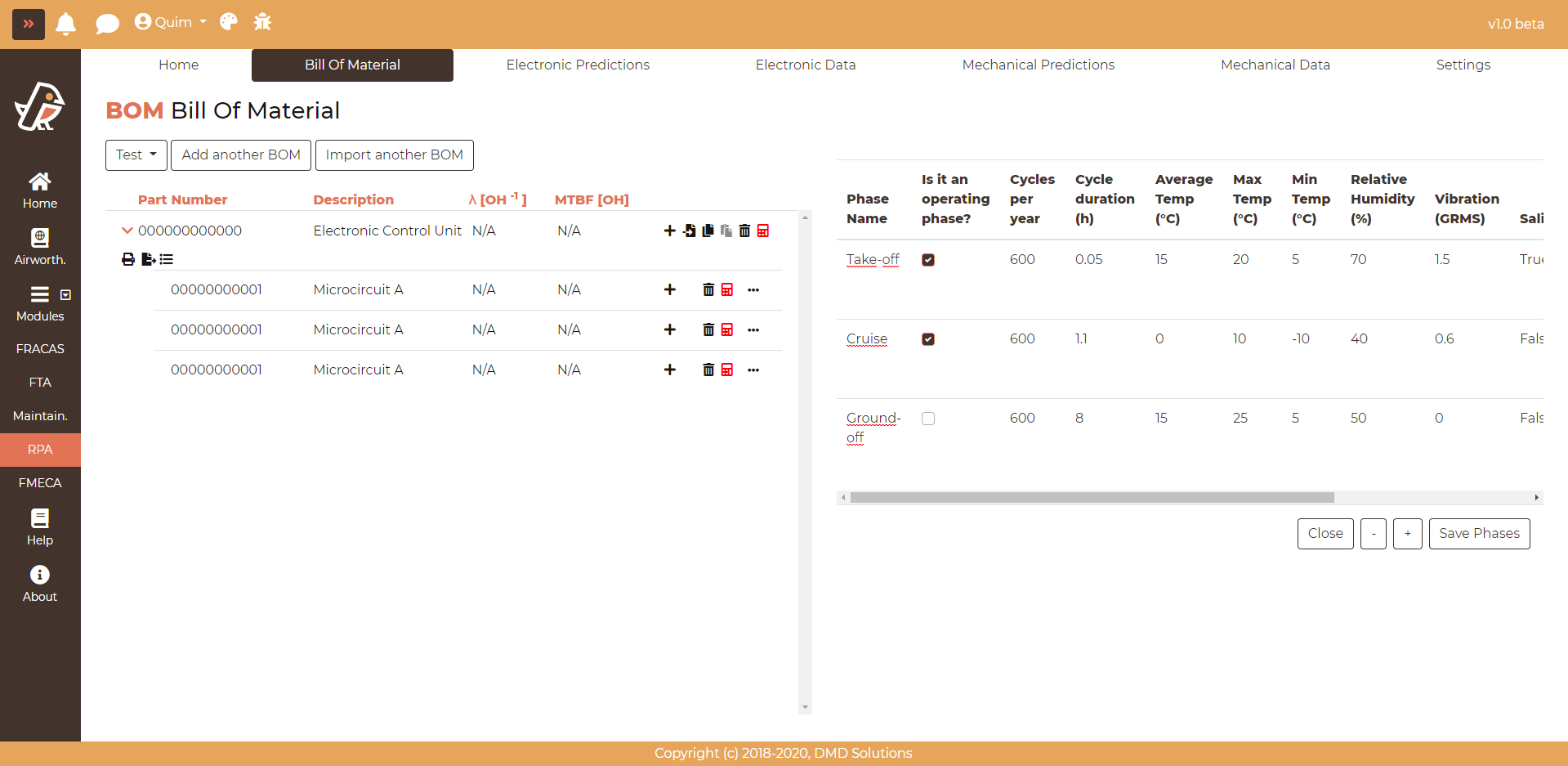 Associate FIDES phases: When clicking it, a table will open on the right side of the screen, allowing to introduce each of the life phases (both operating and non-operating phases) of the assembly for the FIDES computation. The following parameters shall be specified per each FIDES phase: